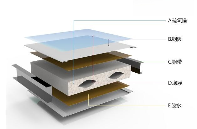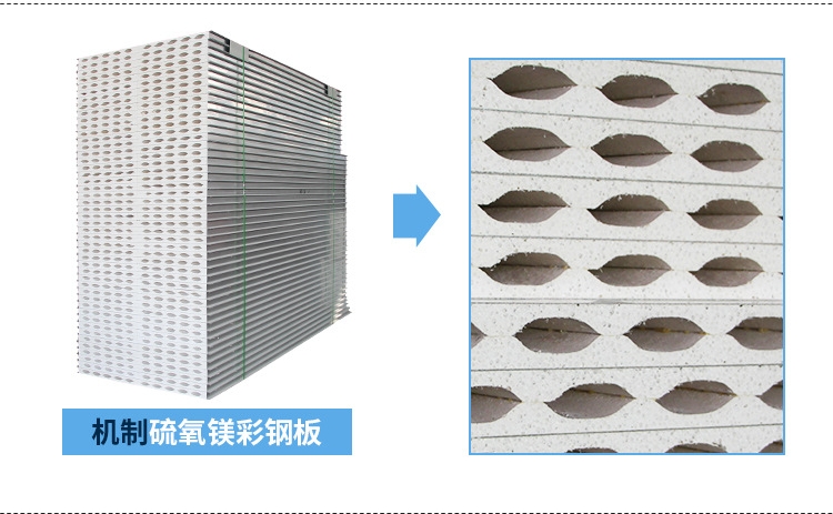 采用硫氧镁为芯材,镀锌或彩涂板为面层(两层)及高强度粘剂,通过高速连续自动化成型机加温、加压复合,经过修边、开槽、下料而成的新一代建筑装潢板材。具有防火性能强、硫氧镁彩钢夹芯板憎水率大于98%,遇水不发生变形和化学反应,强度高夹芯板长度可达到10m承受两个成年人踩踏,保温隔音效果好。